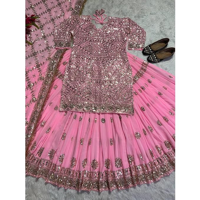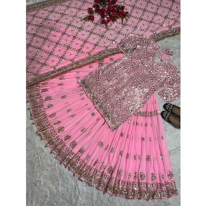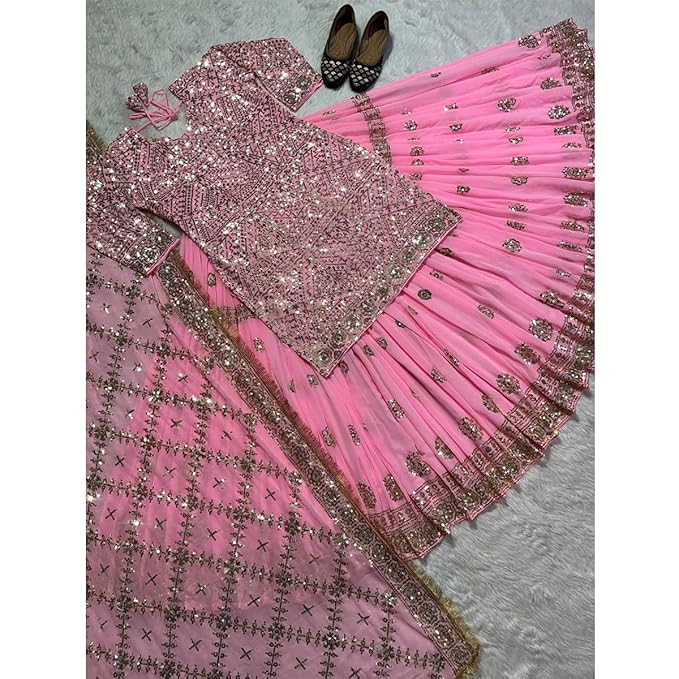 Crop-Top Lehenga Top Fabric:- Faux Georgette Top Size:- M(38),L(40), XL(42),XXL(44 Top Length :- 36 Inches Top Inner:- Silk Lehenga Fabric:- Faux Georgette Lehenga Inner:- Silk Lehenga Flair:- 3 Mtrs ( Lehenga Semi Stitched ) Dupatta Fabric:- Net Dupatta Length :- 2.20 Mtrs