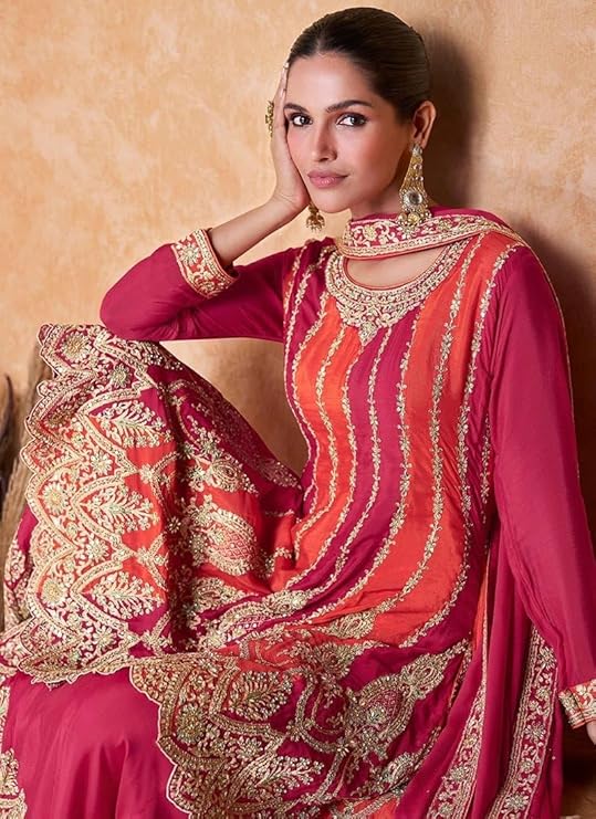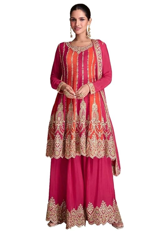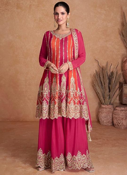 Top Details : Color : Pink, Top Fabric : Chinon, Top Stitching : Stitched, Top Work : Embroidered, Top Length : 42 Inches , Top Type : Flared Top, Product Type : Kurta Palazzo Set, Bottom Details : Bottom Fabric : Chinon, Bottom Stitching Type : Stitched, Bottom Fabric Length : -, Dupatta Details : Dupatta Fabric : Chinon, Dupatta Work : Embroidered, Dupatta Fabric Length : 2.15 Mtrs