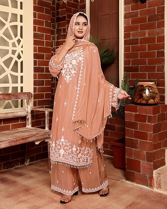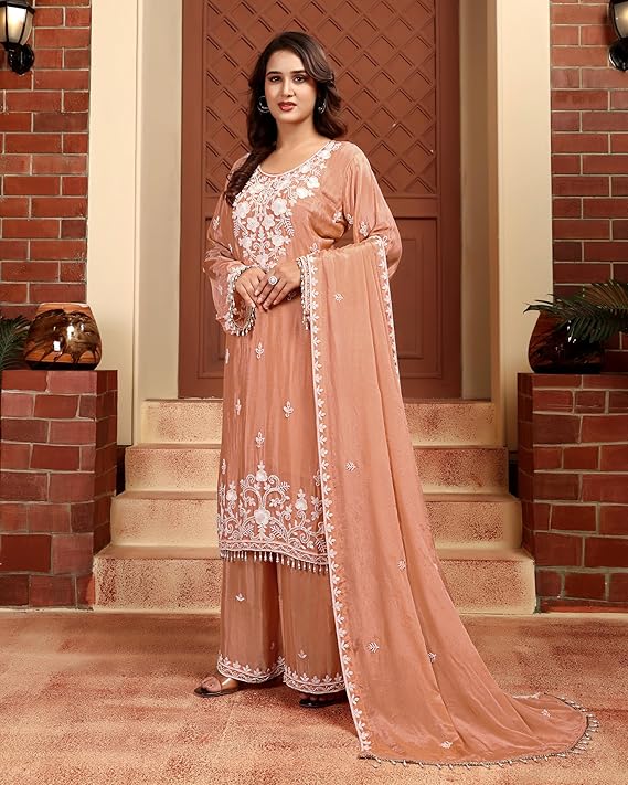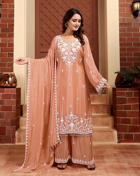 Step into elegance with the Uday Enterprise Women’s Heavy Embroidery and Hand Work Chiffon Silk Readymade Sharara Suit, a perfect blend of tradition and luxury. Crafted from premium chiffon silk, this designer ensemble showcases exquisite hand embroidery and intricate detailing, making it an ideal choice for weddings, festive occasions, and special events. The richly adorned kurta features delicate thread work, sequins, and zari patterns, complemented by a gracefully flared sharara bottom that enhances the traditional look. Paired with a matching embroidered dupatta, this ready-to-wear outfit offers both comfort and style, eliminating the hassle of stitching. Whether you’re a bride’s maid or a guest, this readymade wedding palazzo suit ensures you stand out with grace and poise.